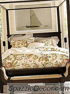 Ein moderner Baldachin aus dunklem Holz und ein florales Bettwäscheset geben ein romantisches Statement ab, ohne dabei pingelig zu sein.