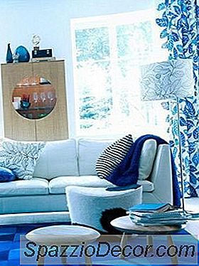 Das Mischen von Mustern in einem Raum funktioniert, wenn Sie dieselbe Farbpalette verwenden. Die weißen Möbel dieses Raumes sind die perfekte Leinwand, auf die Farbe und Muster aufgetragen werden können. Die botanischen Vorhänge, der geometrische Teppich und die gemütliche Decke machen diesen IKEA-Katalograum zu einem wahrhaft blauen Meisterwerk.