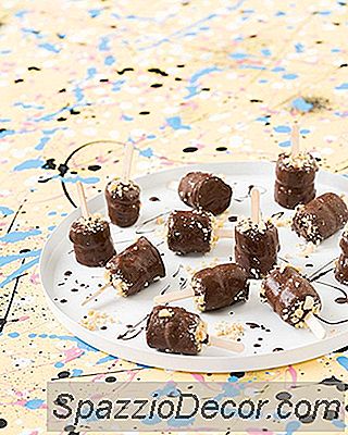 Schritt 4: Wenn die Pops gefroren sind, einfach die geschmolzene Schokolade eintauchen und mit Meersalz und gehackten Erdnüssen bestreuen. Fahren Sie fort, bis alle Bananenstiche überzogen sind. Kehren Sie auf das Backblech zurück und frieren Sie es 2 Stunden lang ein, um es auszuhärten.